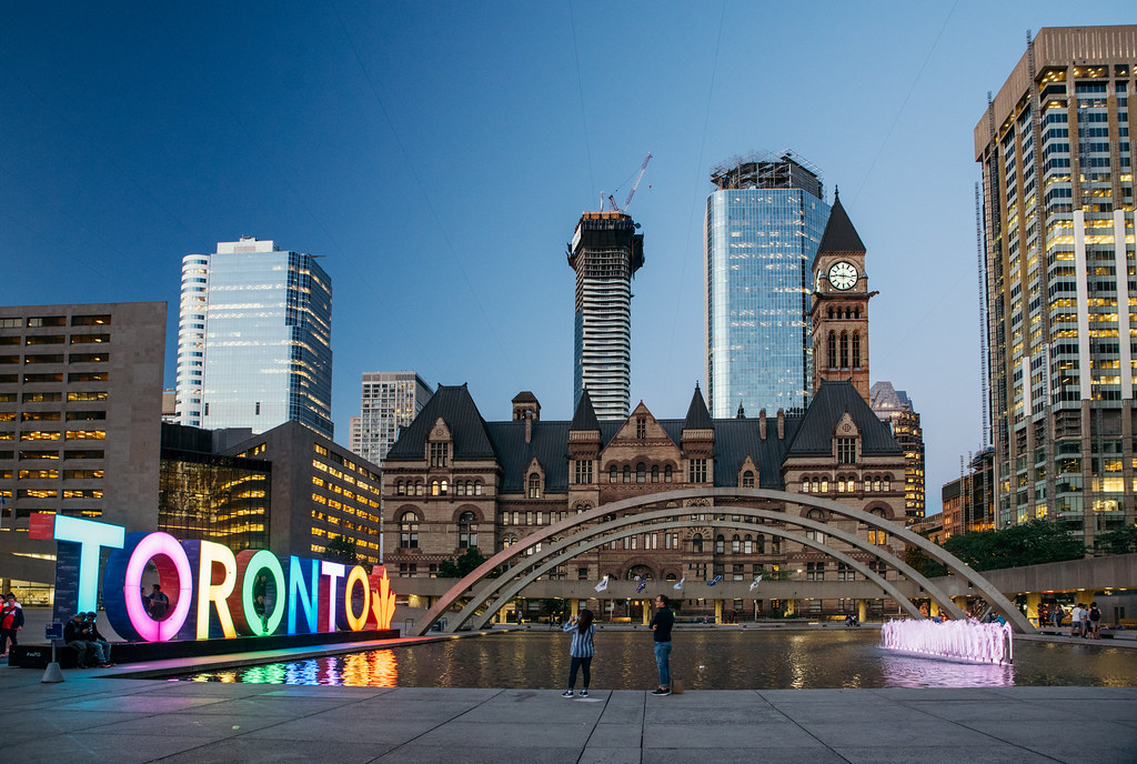 9:00h – Passeio a pé de 2h em Toronto com guia em português. Visita a Dundas Square, a famosa mini-Times Square no centro de Toronto, e paradas no prédio da Velha Prefeitura (Old City Hall), cidade subterrânea (PATH), e aprenderemos sobre os edifícios e a economia do Canadá no Distrito Financeiro. Visitaremos a icônica galeria Brookfield Place, a Fonte dos Cachorrinhos (Dog Park), Flatiron Building e o Mercadão de St. Lawrence.